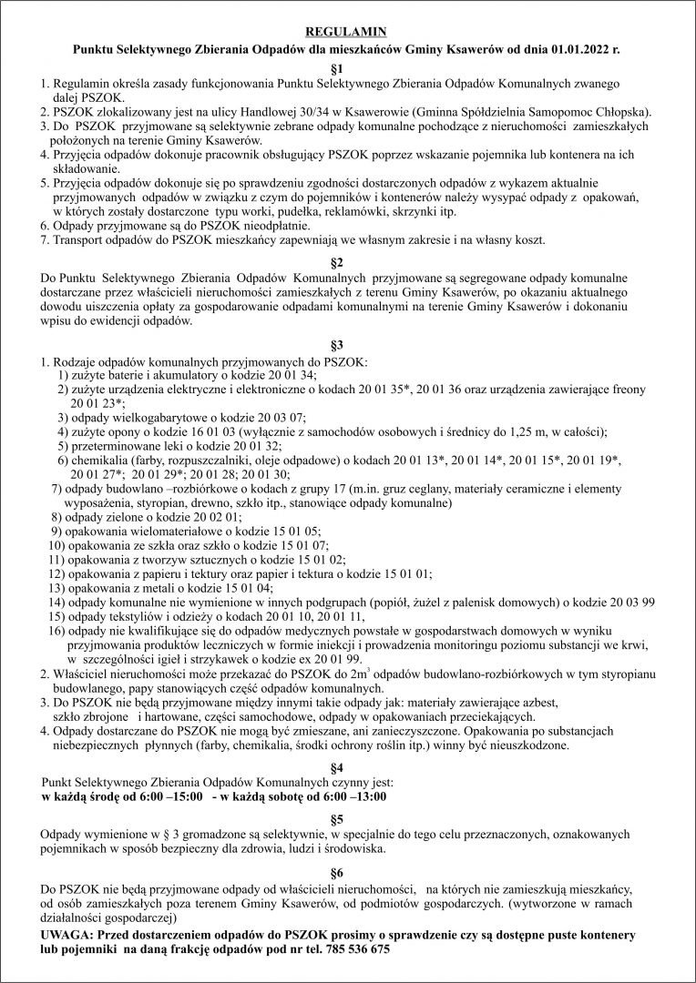 Ulotka informacyjna - Regulamin Punktu Selektywnego Zbierania Odpadów od dnia 1 stycznia 2022 r.